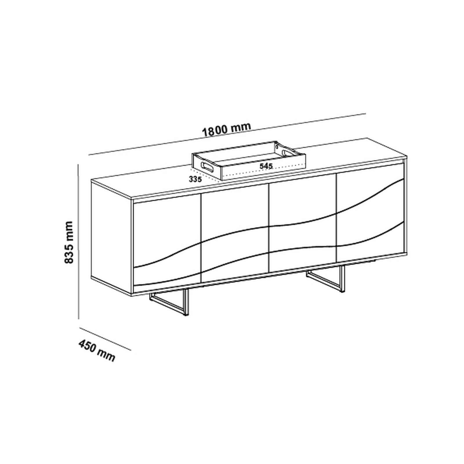 180cm de largura × 83.5cm de altura × 45cm de profundidade. Ideal para organizar louças e objetos de decoração.