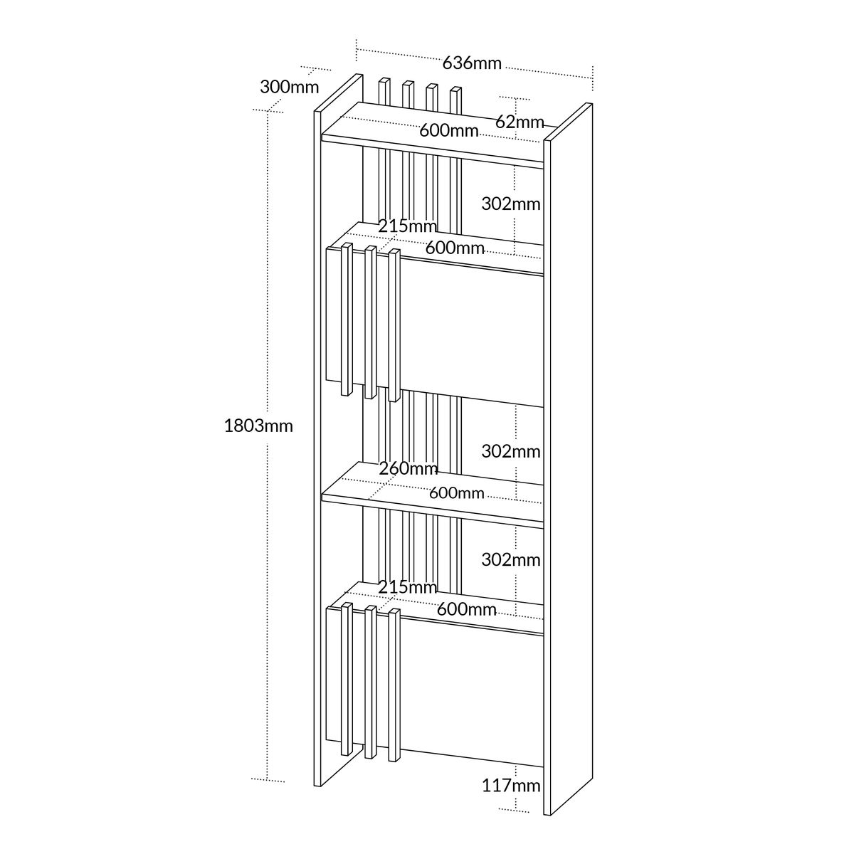 63.6cm de largura × 180.3cm de altura × 30cm de profundidade. Confira se o pé-direito do seu ambiente comporta a altura.