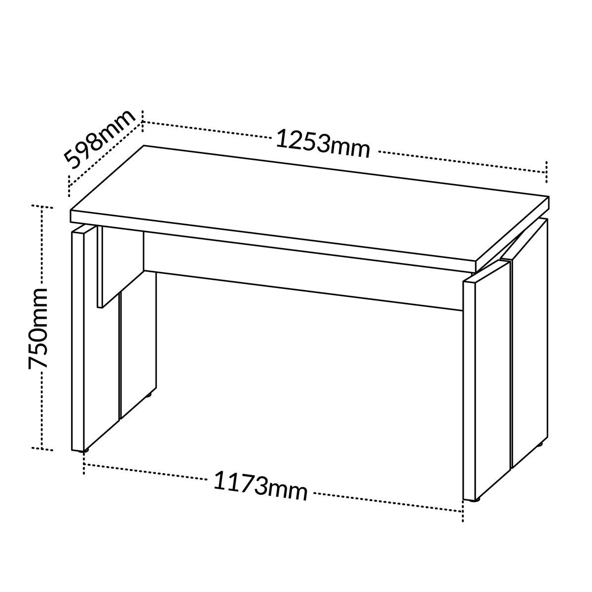 125.3cm de largura × 75cm de altura × 59.8cm de profundidade. Espaço amplo para monitores, documentos e acessórios de escritório.