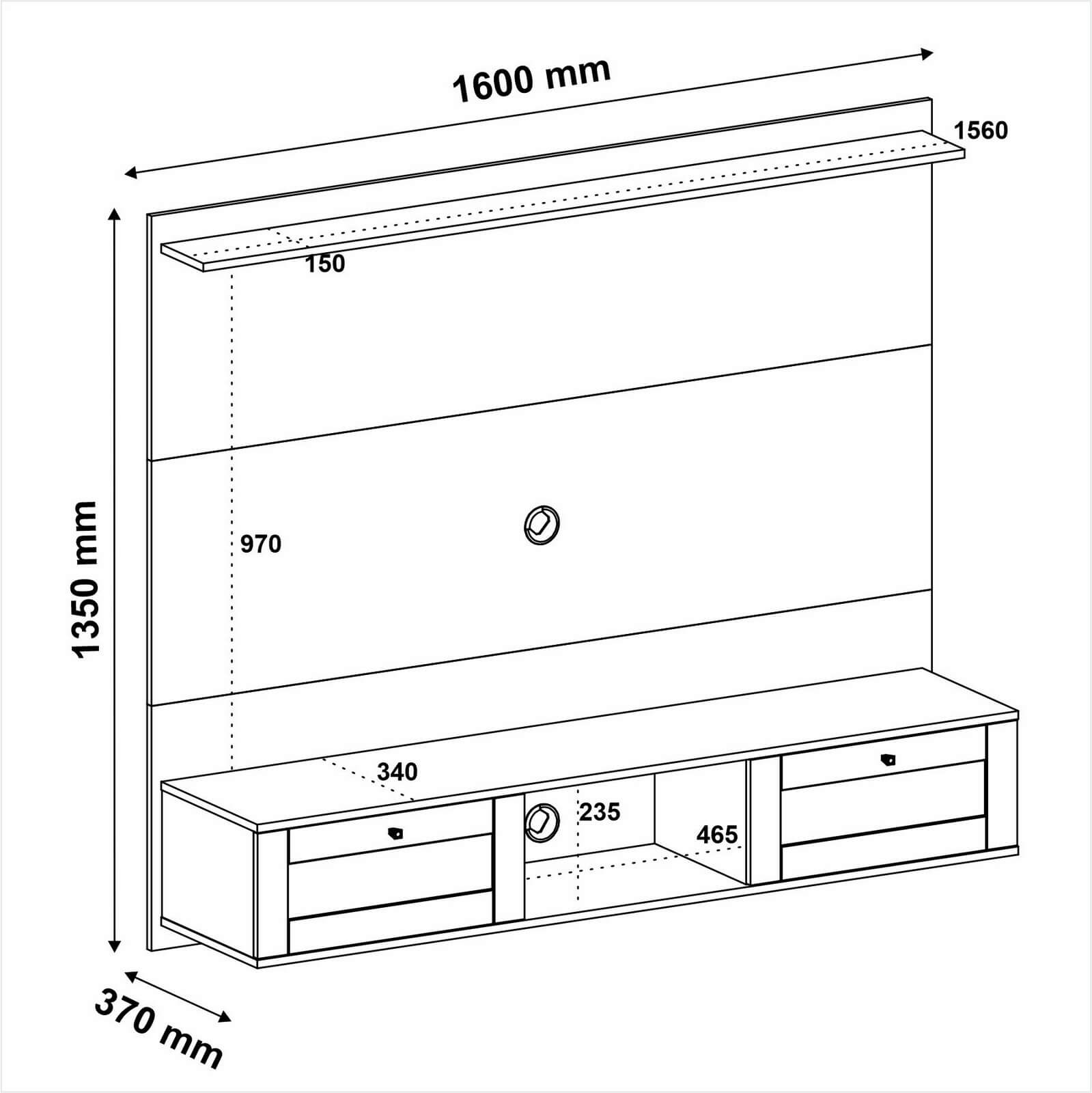 Serve para TV de até 72 polegadas. Largura total de 1,60m. Antes de comprar, confira se a base da sua TV cabe no tampo.