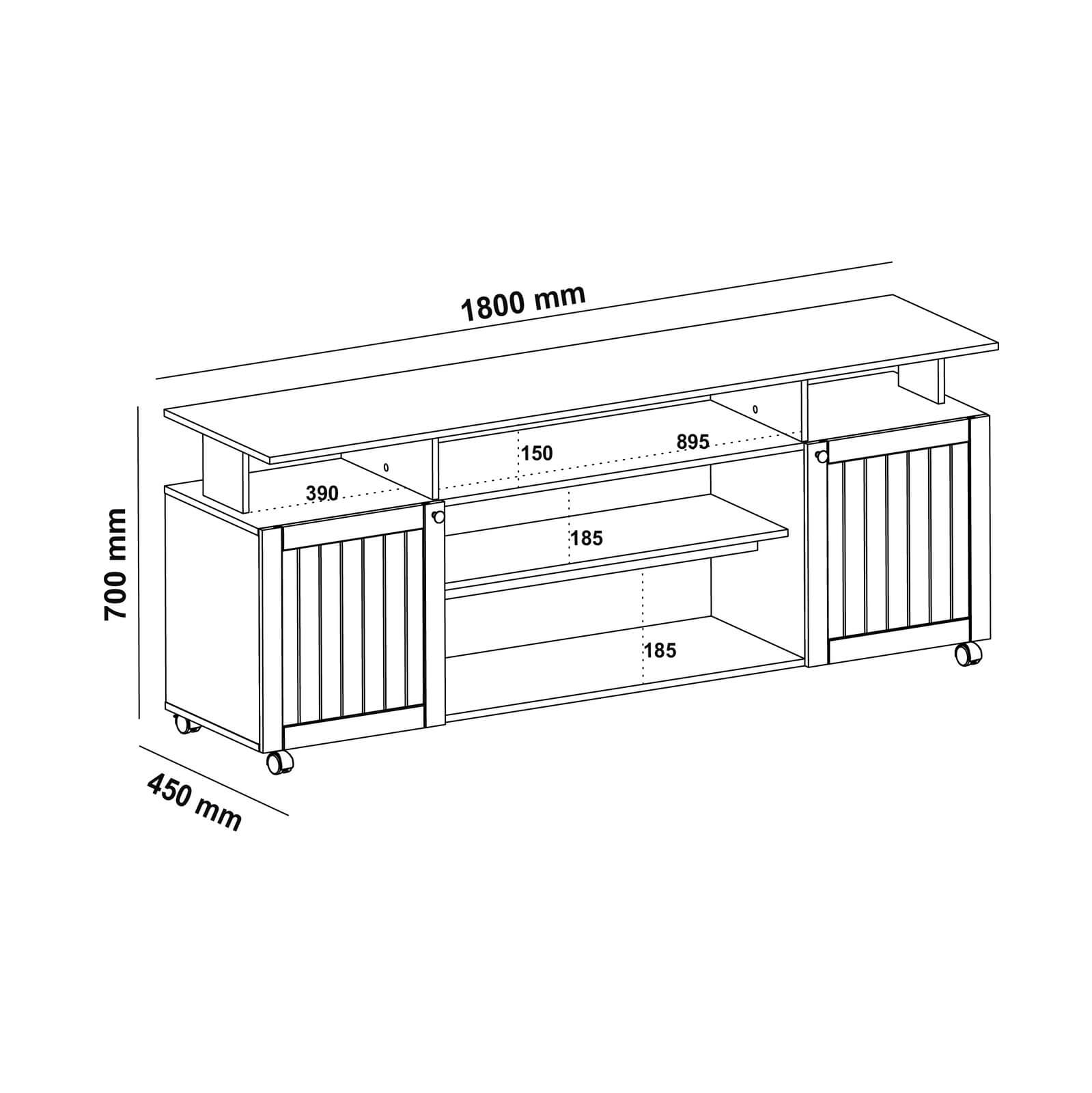 Serve para TV de até 75 polegadas. Largura total de 1,80m. Antes de comprar, confira se a base da sua TV cabe no tampo.